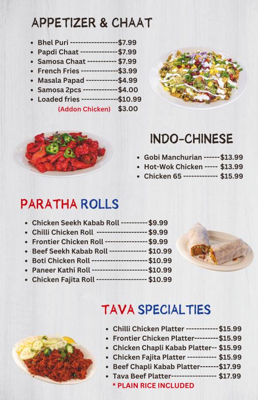 Kabab Mahal features an extensive menu showcasing a variety of Pakistani and Indian favorites. The extensive list includes appetizers like Samosa Chaat, perfect for sharing, along with main dishes that cater to various tastes.